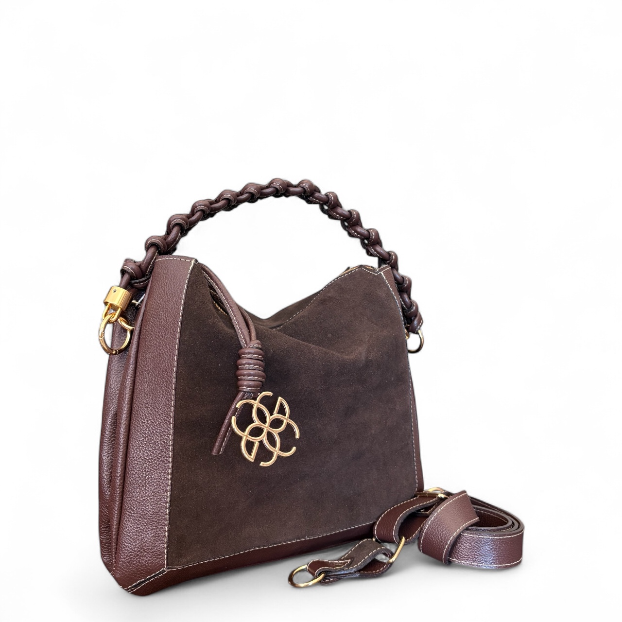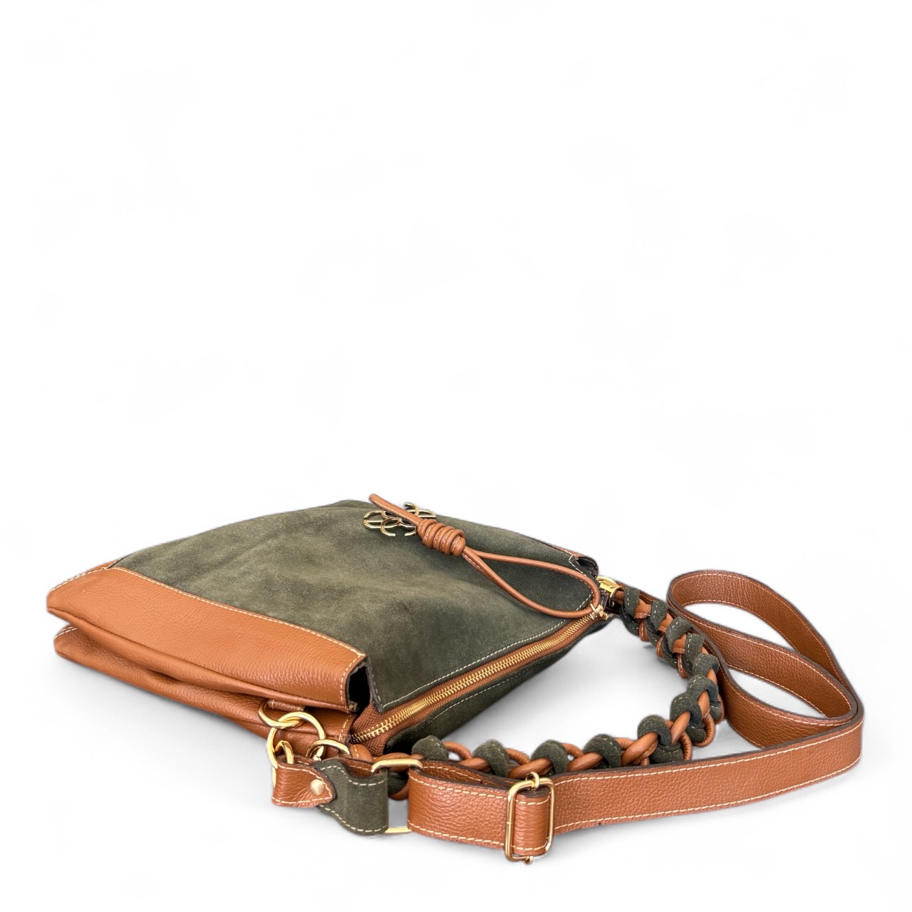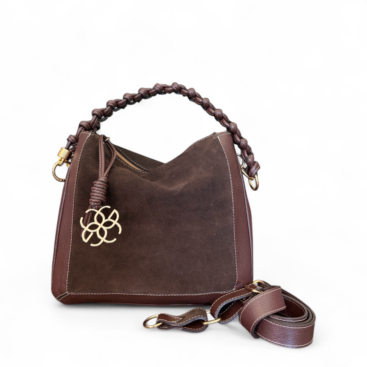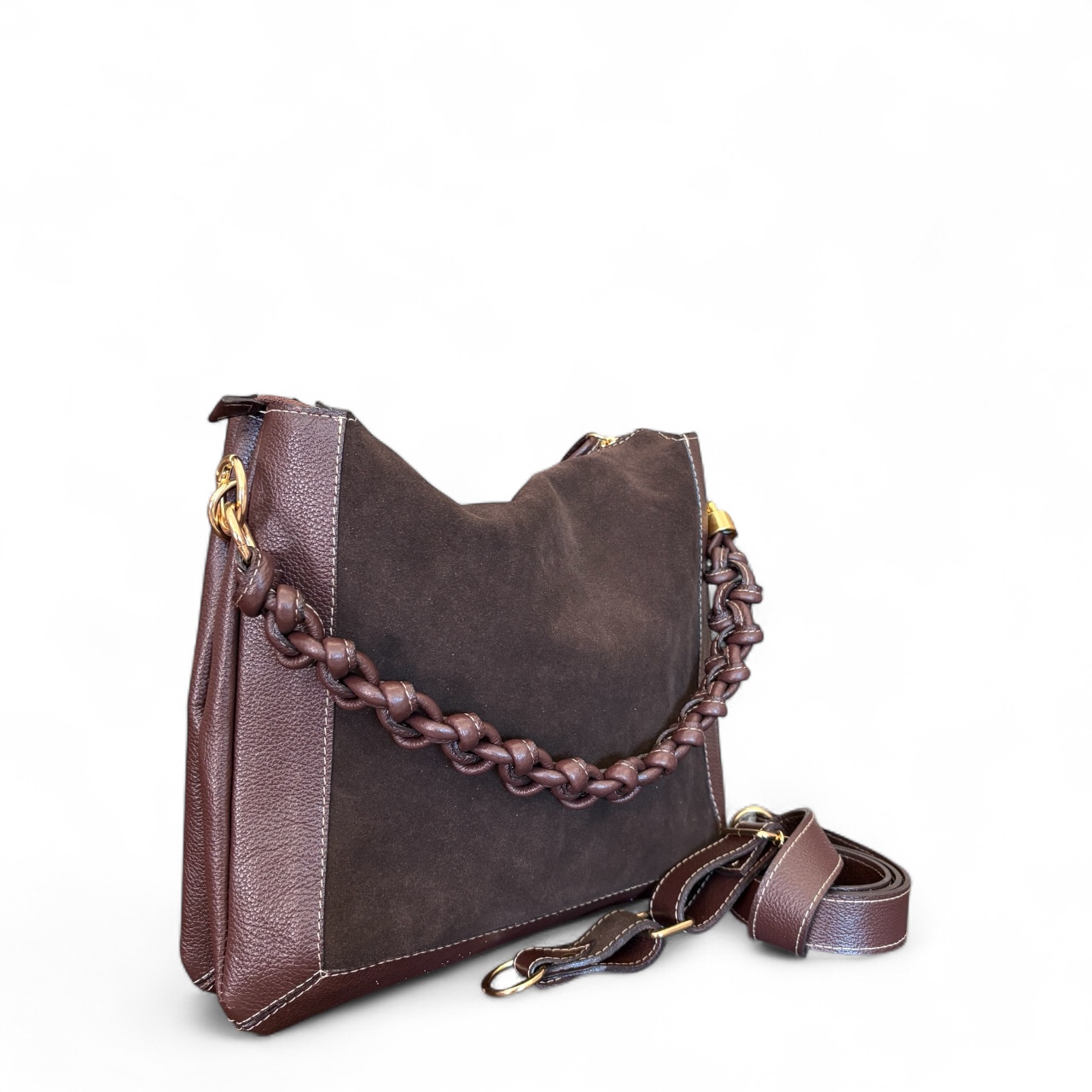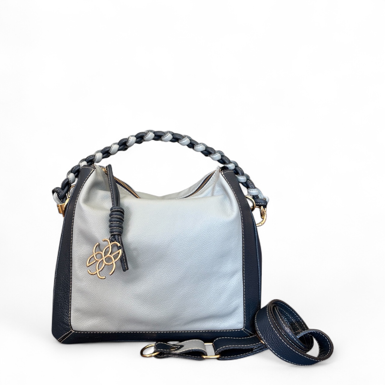 Internamente possui duas divisões com opções de bolsos internos. Alça de ombro transada manualmente e opção também da alça transversal.